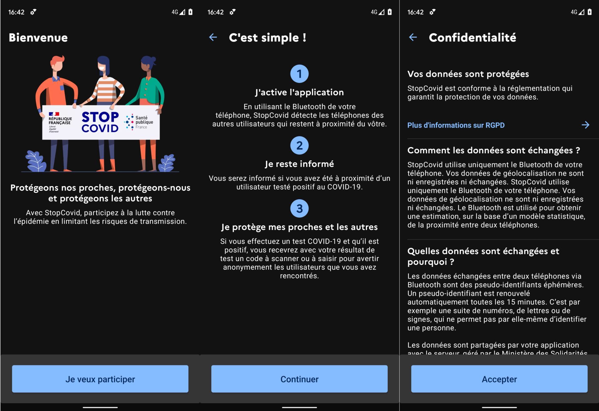 Ouvrez l’application et appuyez sur Je veux Participer. StopCovid affiche un rapide récapitulatif de son fonctionnement. Appuyez ensuite sur Continuer, puis sur Accepter pour valider les conditions d’utilisation (bien évidemment après avoir lu l’ensemble des informations sur la Confidentialité).