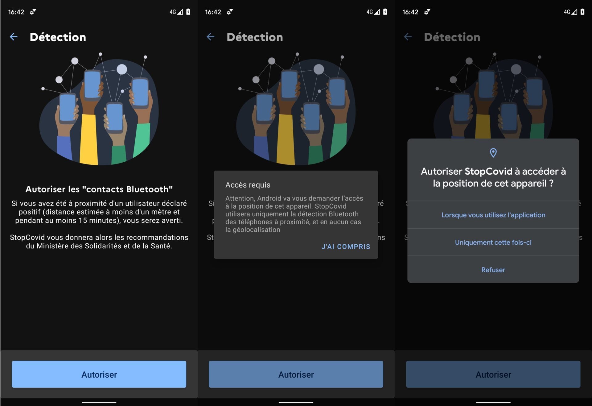 En réalité StopCovid n’accèdera pas à votre GPS mais uniquement au module Bluetooth utilisé pour détecter les smartphones des utilisateurs à proximité. Validez ces autorisations et veillez à choisir Lorsque vous utilisez l’application au moment ou Android demande d’Autoriser StopCovid à accéder à la position de l’appareil, sans quoi l’application sera inutilisable.
