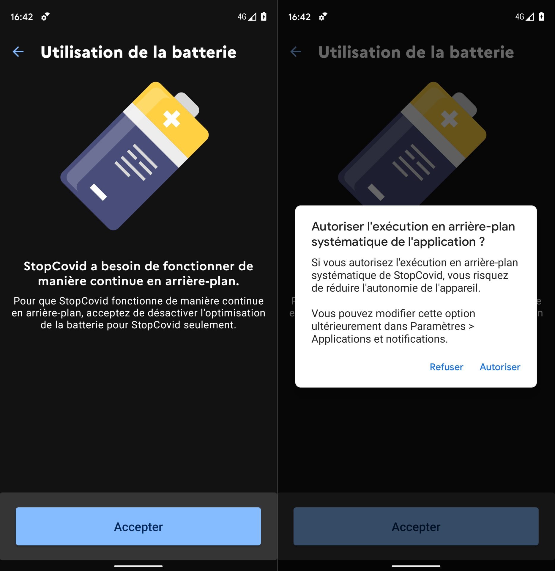 Pour être efficace, l’application a besoin de fonctionner en arrière-plan sans interruption. Vous devrez alors Accepter que celle-ci désactive l’optimisation de la batterie pour StopCovid et valider votre choix.