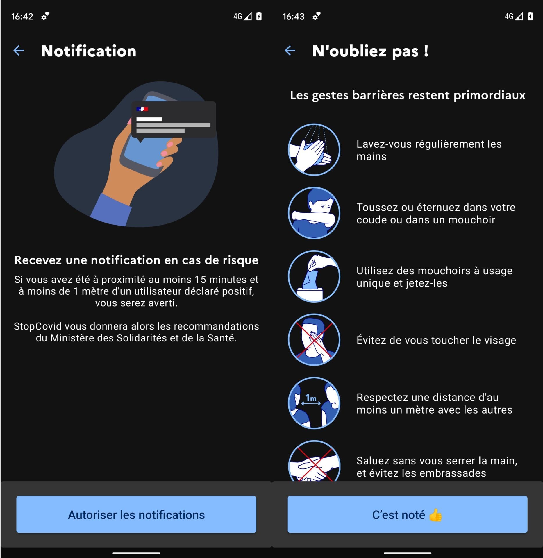 Enfin, il vous faudra Autoriser les notifications. Cela tombe sous le sens puisque c’est par ce biais que vous serez alerté dans le cas où vous auriez croisé un malade du covid-19.