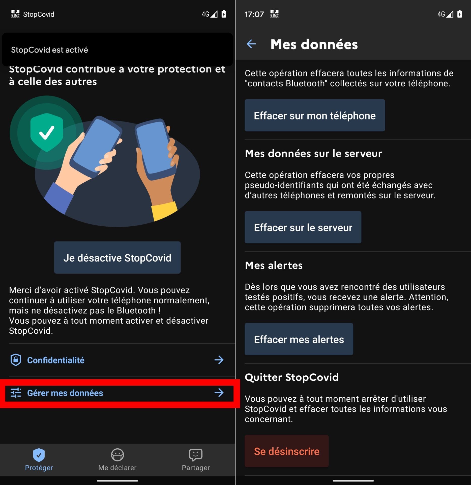 Pour ce faire, entrez dans le menu Gérer mes données. Vous pourrez alors effacer les informations de « contact Bluetooth » enregistrées sur votre smartphone, effacer vos données sur le serveur, ou encore effacer les alertes.