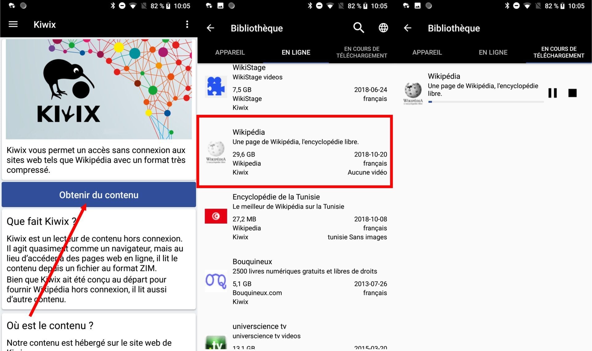 Sur Android, lancez Kiwix et appuyez sur Obtenir du contenu. Placez-vous sur l’onglet En ligne, et faites défiler les contenus pour télécharger la version de l’archive de Wikipédia souhaitée. Prenez votre mal en patience le temps que le téléchargement du fichier soit terminé. Si vous procédez ainsi, vous pouvez arrêter la lecture ici, Wikipédia hors ligne étant immédiatement opérationnel après la fin du téléchargement de l’archive.