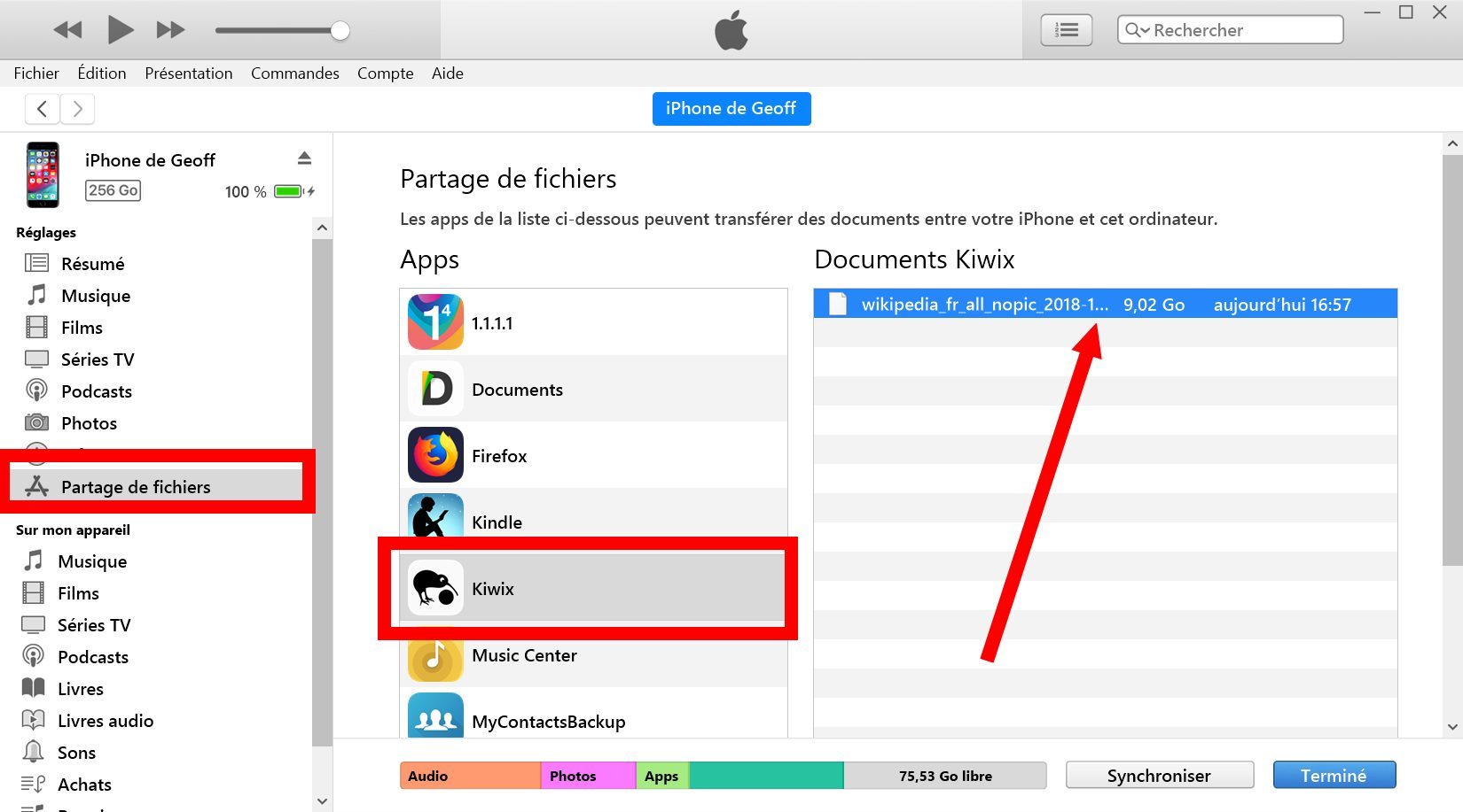 Ouvrez iTunes et entrez dans la fenêtre de synchronisation de l’iPhone. Dans la colonne de gauche, cliquez sur Partage de fichiers puis sélectionnez Kiwix. Glissez-déposez l’archive Wikipédia au format ZIM dans le volet Document Kiwix.
