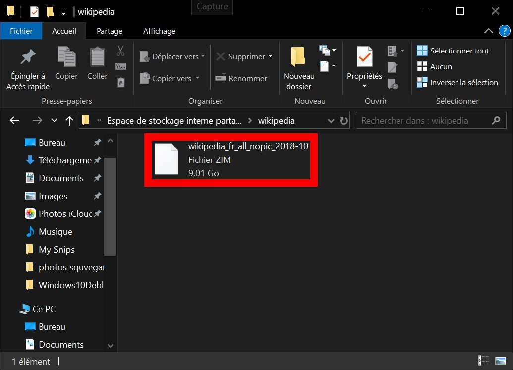 Sur Android, connectez votre appareil à votre PC à l’aide d’un câble USB et activez le mode permettant de Transférer des fichiers. Glissez-déposez l’archive Wikipédia dans un répertoire de la mémoire de votre smartphone.