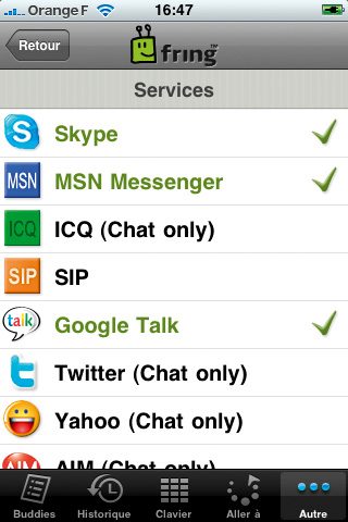 Au lieu d’échanger des SMS, restez connecté sur votre messagerie instantanée ou utilisez votre compte Skype pour téléphoner avec Fring (vous n’avez pas besoin de Jailbreak). Sachez que les communications vocales ne fonctionnent normalement que lorsque vous êtes connecté en Wi-Fi.