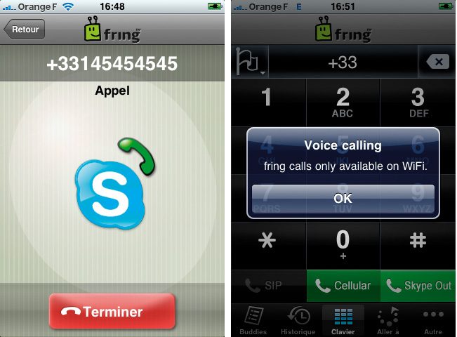 Vous pouvez dès lors désactiver, si nécessaire, la connexion Wi-Fi sur l’iPhone (via le menu Réglages, WiFi), relancer Fring et appeler un numéro de téléphone via Skype (mais en utilisant le réseau 3G de votre opérateur) comme indiqué à l’étape précédente.