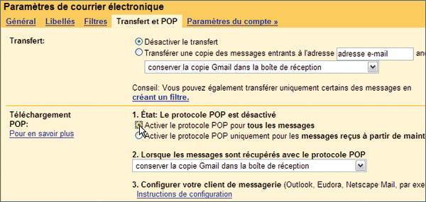 en haut de la page. Cliquez ensuite sur Transfert et POP, puis, dans la partie Téléchargement POP, sélectionnez l’option Activez le protocole POP pour tous les messages. Validez en cliquant sur le