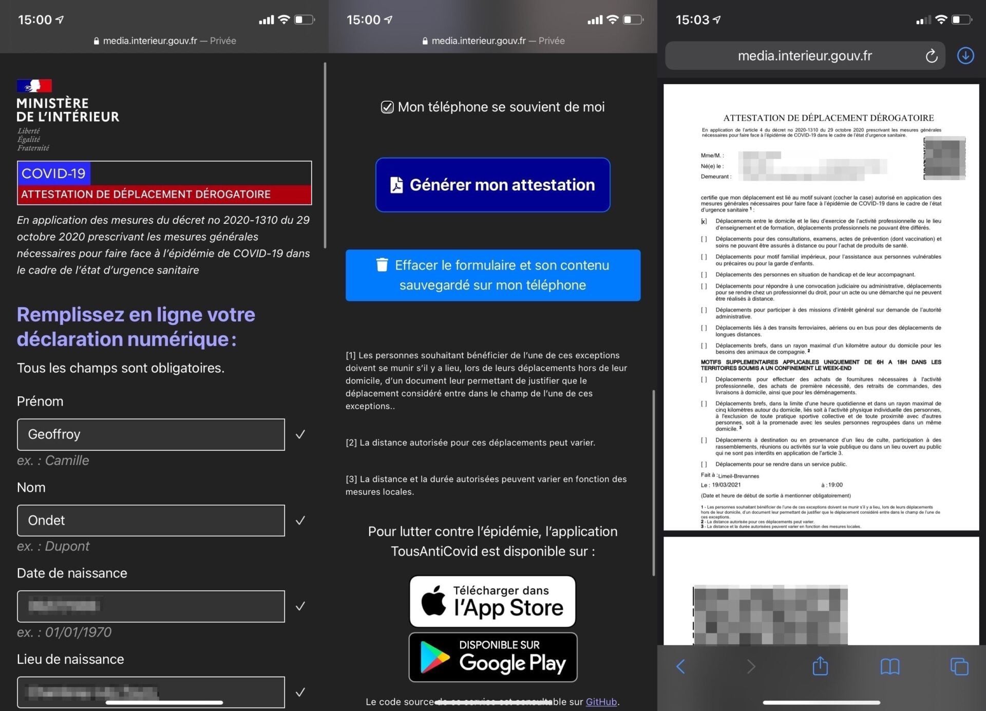 Deuxième possibilité pour générer l’attestation de sortie, passer par le site web dédié qui permet de générer une attestation au format PDF comprenant un QR Code. Accessible aussi bien depuis le navigateur Web d’un ordinateur que d’un smartphone, elle est la solution privilégiée par tous les citoyens qui souhaitent pouvoir la générer facilement pour la présenter sur l’écran de leur smartphone, avoir à télécharger d’application. Elle conviendra par ailleurs à tous ceux qui suspectent le Gouvernement de vouloir les pister et surveiller leur très intéressante vie privée puisque l’attestation est générée localement sur l’ordinateur ou le smartphone utilisé. A priori, aucune donnée personnelle n’est donc siphonnée.
