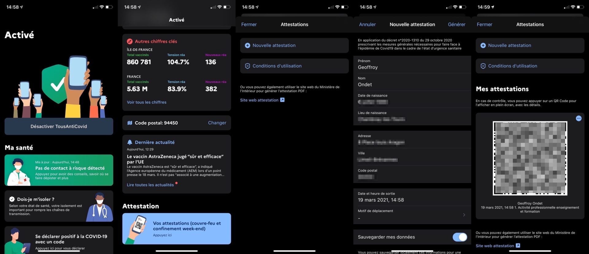 Mais TousAntiCovid ne sert pas qu’à cela. L’application fournit également de nombreuses statistiques et chiffres clés sur les nouveaux cas, nombres de vaccinés, tensions hospitalières, etc. Surtout, elle pourra servir à générer rapidement une attestation pour vos sorties. L’application conserve vos principales informations pour générer plus rapidement votre attestation. Vous n’aurez qu’à renseigner à chaque fois le motif de sortie.