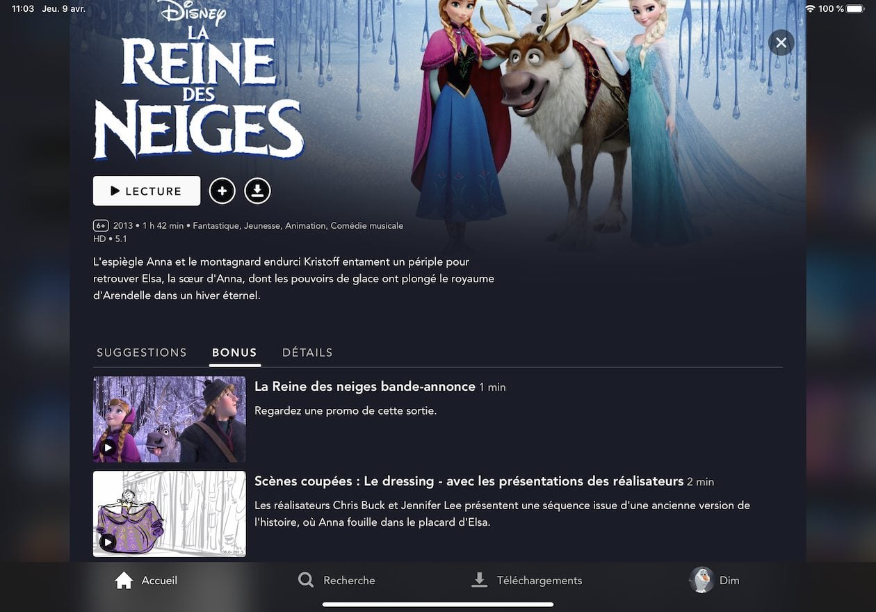 Pour télécharger un film ou un épisode d’une série il suffit de cliquer sur sa fiche, dans un premier temps, puis sur l’icône de téléchargement. L’ensemble des contenus visibles hors connexion, se retrouvent dans la rubrique téléchargement de votre application. Disney+ n’indique pas, pour le moment, la durée pendant laquelle ils sont disponibles. Bien évidemment, cette fonctionnalité est disponible sur smartphone et tablette mais pas sur ordinateur.