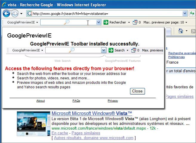 GooglePreviewIE affiche une vue miniature des pages affichées lors d’une recherche sur Google. Il n’est donc plus nécessaire de cliquer sur le lien et d’ouvrir une nouvelle page pour vérifier si celle-ci répond