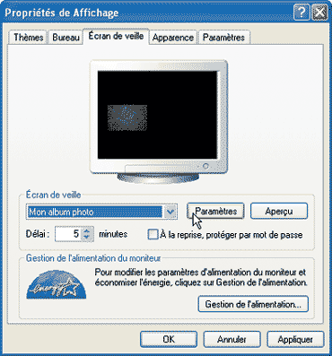 Propriétés. Dans la nouvelle fenêtre, cliquez sur l’onglet Ecran de veille et sélectionnez dans la liste Mon album photo.