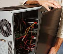Après avoir agencé proprement les câbles de façon qu’ils ne frottent pas sur les ventilateurs, replacez les panneaux latéraux du boîtier. Il n’est pas nécessaire de replacer la conduite d’air spécifique au boîtier au-dessus de