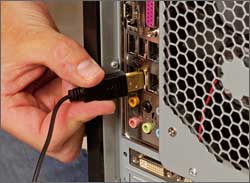 Placez ensuite votre ordinateur sur un bureau pour y connecter la souris. Elle se branche au choix sur l’un des connecteurs USB.