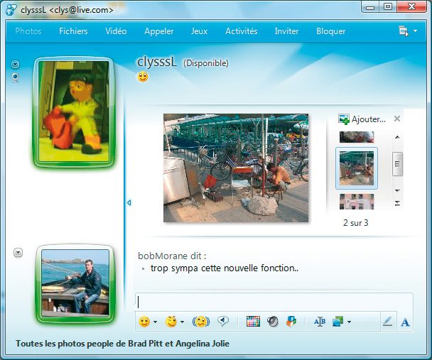 Un simple clic sur le menu Photos permet de partager des images instantanément. Le diaporama s’affiche chez les deux interlocuteurs. A tout moment, chacun peut ajouter une photo par un simple glisser-déposer et commenter les images, voire les enregistrer sur son disque dur.