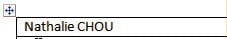 Cliquez dans la première cellule de la première ligne du tableau et tapez vos nom et prénom. Appuyez deux fois sur la touche Tabulation du clavier pour atteindre la première cellule de la seconde ligne et tapez les informations de votre choix (adresse, téléphone…) Continuez ainsi jusqu’à remplir la première colonne du tableau.