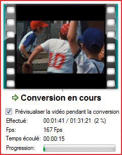 4 – Patientez le temps qu’il faudra. On prévisualise le fichier converti et la progression de l’opération. Notez la valeur Fps, de l’ordre de 200 sur un PC portable Core2 Duo T7500. Cela correspond à
