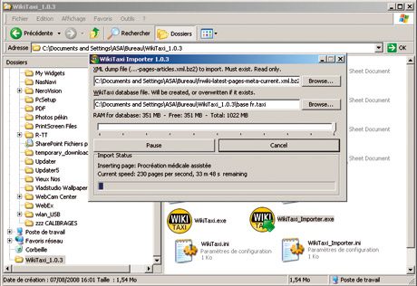 Après avoir téléchargé la ou les bases de données qui vous intéressent, vous devez transformer les fichiers XML de Wikipédia en bases de données lisibles par WikiTaxi. Cela peut prendre là aussi beaucoup de temps, selon la puissance