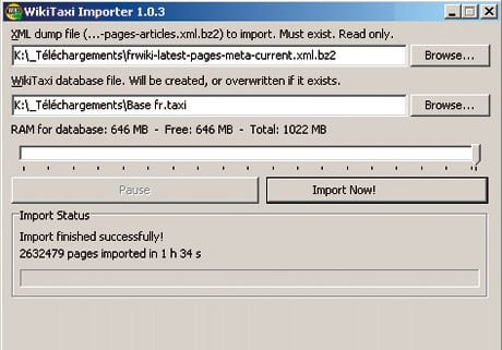 Import now! pour démarrer l’importation. Une fois la sauvegarde intégrée, le logiciel donne un récapitulatif. Dans notre cas, quelque 2 632 000 pages de la base française ont été intégrées et l’importation