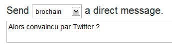 Tout est public sur Twitter. Enfin, presque : le lien Direct Messages (cf. Twitter illustré : 9) permet d’envoyer un message confidentiel à un autre twittiste. Cliquez sur le lien.
