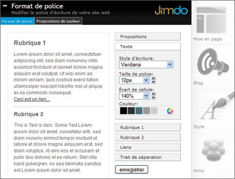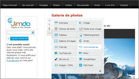 forme de signe + ou de corbeille.Pour modifier le site graphiquement, vous avez aussi accès à un menu dans la colonne de droite. Cliquez sur l’icône Mise en page pour faire apparaître toutes les mises en page préprogrammées par l’équipe de Jimdo.