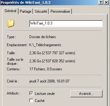 Pour connaître la quantité d’espace que ce dossier occupera, faites un clic droit de la souris sur le dossier WikiTaxi et, dans le menu qui s’affiche, choisissez Propriétés puis regardez le