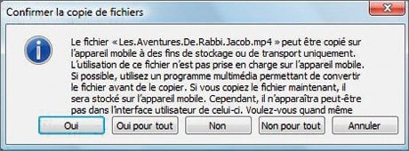 8 – A la demande de confirmation, répondez Oui et patientez durant le transfert.9 – Fermez le dossier contenant vos vidéos (celui du point 1) et débranchez votre mobile du câble USB le reliant au PC. Quittez le Gestionnaire pour appareils Windows Mobile ou ActiveSync.