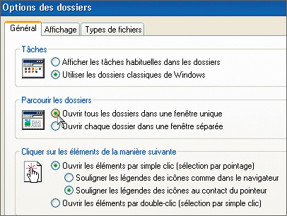 Dans l’explorateur de Windows, lorsque vous double-cliquez sur l’icône d’un dossier, il s’ouvre, bien sûr, mais l’ouverture peut se faire de deux manières : dans une nouvelle fenêtre, ou bien dans la même.La première façon n’est pas la meilleure, car elle conduit vite à noyer le bureau sous une avalanche de fenêtres, de plus en plus difficiles à repérer. Le choix entre les deux modes de fonctionnement s’effectue dans la fenêtre