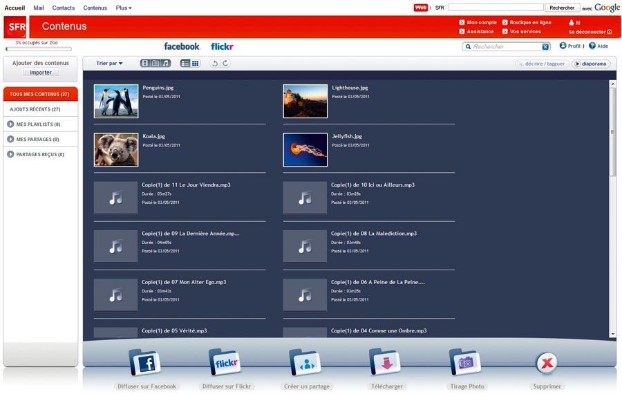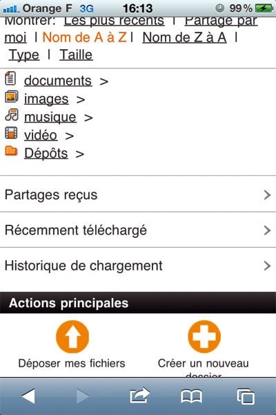 Pour y accéder, via votre navigateur mobile, rendez-vous à l’adresse http://mescontenus.orange.fr. Identifiez-vous à l’aide de votre numéro de mobile et de votre mot de passe. Vous pouvez alors naviguer dans vos différents dossiers (photos, musiques, vidéos…). Malheureusement, le service n’est pas encore tout à fait opérationnel avec tous les types de smartphones en ce qui concerne le dépôt de fichiers depuis un téléphone. Si vous disposez d’un smartphone Android, vous pouvez télécharger n’importe quel type de fichiers depuis votre mobile en cliquant sur le lien Déposer mes fichiers. En revanche, avec les téléphones utilisant un autre système d’exploitation, vous ne pourrez qu’y déposer des photos, soit via l’envoi d’un MMS (attention à la facture !), soit en utilisant l’application Orange Photo fournie avec votre mobile Orange.