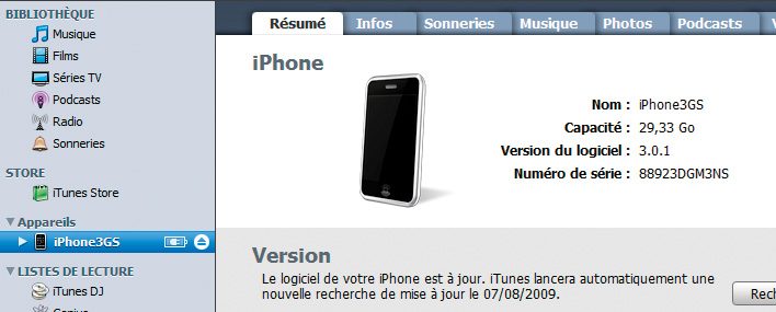 Toutes les manipulations concernant le Jailbreak ont été faites avec la version 3.0.1 de l’OS de l’iPhone. Si votre version est plus ancienne, mettez-la à jour. Attention : les versions ultérieures (en particulier la toute nouvelle 3.1) ne sont pas compatibles avec la version actuelle du programme de Jailbreak.