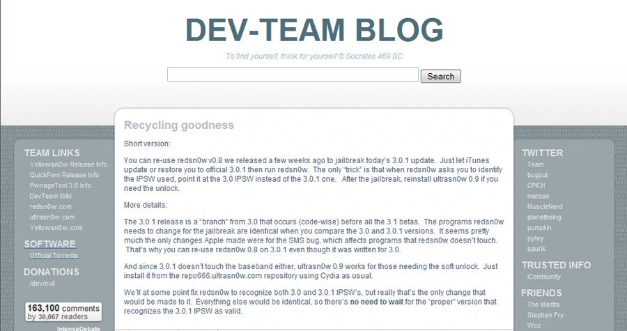 Pour supprimer les limitations de votre iPhone, vous devez modifier le logiciel interne (firmware) de votre machine. Le programme RedsnOw (attention : l’avant-dernier caractère est un zéro et non la lettre « o ») se charge de cette tâche. Obtenez-le sur le site officiel de ses créateurs : http://blog.iphone-dev.org.