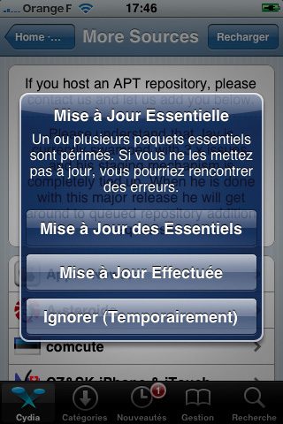 Afin d’achever l’installation de cette application, cliquez sur Cydia. Une fois la mise à jour installée, Cydia se referme. Cliquez à nouveau sur Cydia ; l’application s’affiche désormais en partie en français.