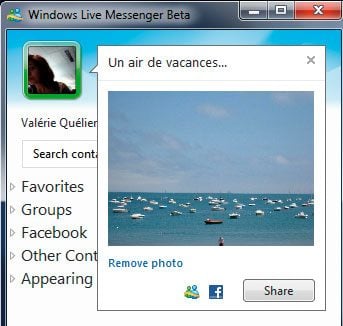 Au choix ! La fenêtre Windows Live Messenger (WLM) s’affiche en mode classique ou étendu. Le premier mode d’affichage, plus sobre et discret, ressemble à s’y méprendre à celui des précédentes versions de Live Messenger… à quelques exceptions près. Ainsi, à partir du moment où vous associez vos comptes WLM et Facebook, l’icône du réseau social apparaît à côté de celle de Messenger, dans la fenêtre vouée aux messages d’humeur. De fait, vous pouvez partager une photo ou un lien sur Facebook à partir de WLM.