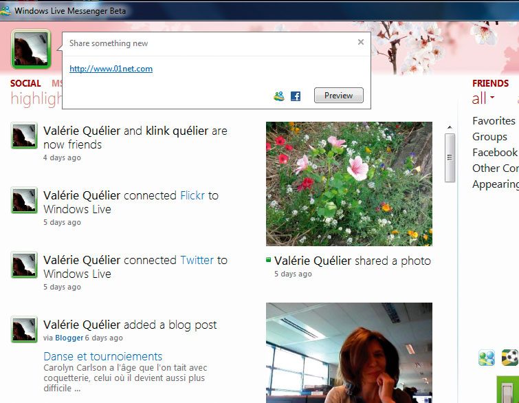 Le mode d’affichage étendu réunit toutes les nouveautés de WLM. Outre la liste des contacts, elle donne accès à deux onglets : Social et MSN. Cliquez sur MSN pour suivre l’actualité internationale, cliquez sur Social pour suivre votre actualité. Celle de vos réseaux sociaux. Sous l’onglet Social, cinq rubriques : highlights, recent, me, photos et more. Highlights permet d’afficher une sélection – a priori arbitraire – de messages laissés par ses contacts sur Facebook ou sur un autre réseau social. Recent permet de voir les messages les plus récents de ses contacts, me d’afficher ses propres messages, et photos de voir les photos de ses contacts. Cliquer sur more déroule un menu contenant Statuts, Links et Blogs… pour afficher les derniers statuts, liens et posts de ses contacts.