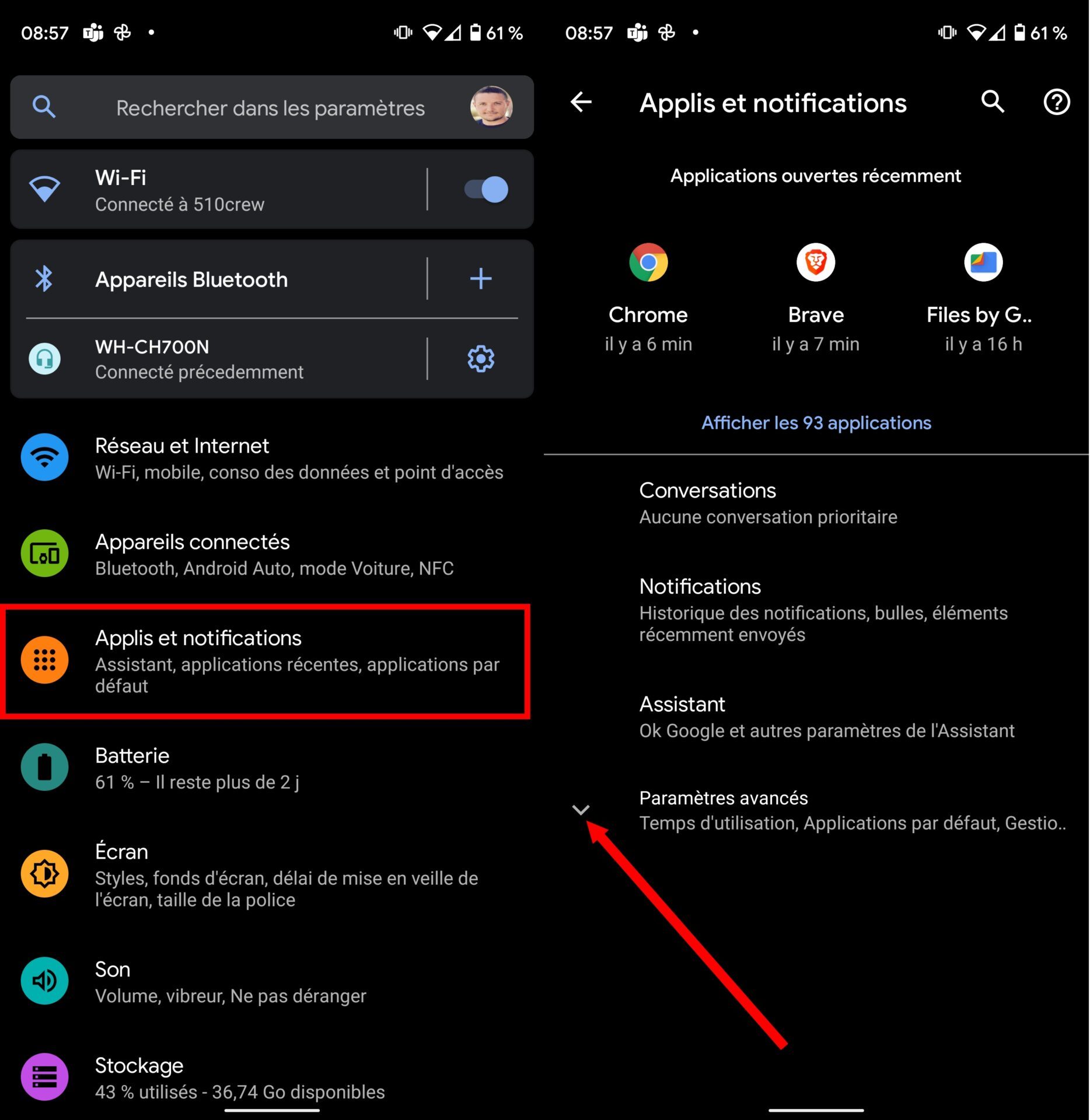 Mais avant cela, vous devrez autoriser votre appareil à installer des applications provenant de sources inconnues. Pour ce faire, ouvrez les Paramètres, rendez-vous dans Applis et notifications puis déployez les Paramètres avancés.