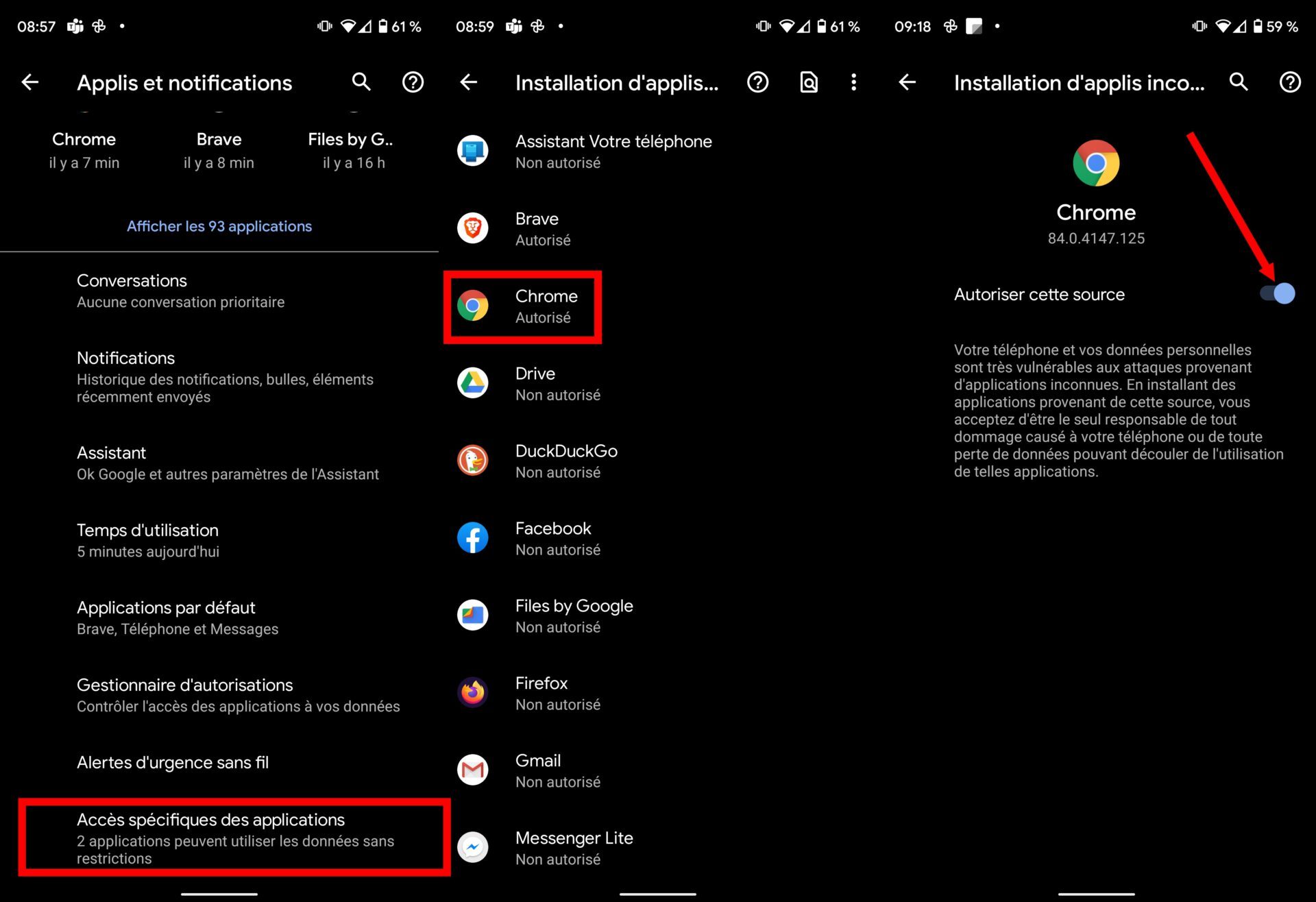 Entrez ensuite dans le menu Accès spécifiques des applications et entrez dans le menu Installation d’applis inconnues. Repérez le navigateur web installé sur votre smartphone avec lequel vous compter installer l’apk, entrez dans les détails et activez l’option Autoriser cette source.