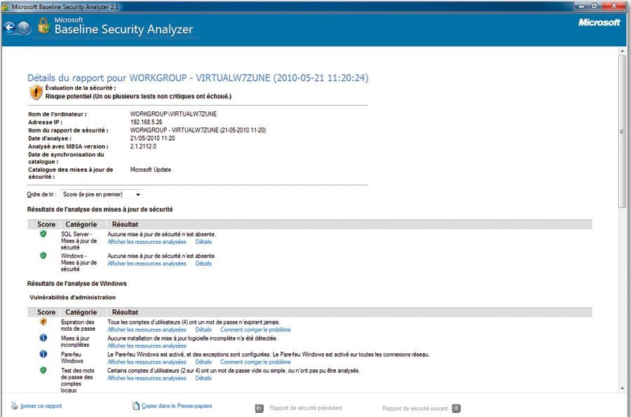 Il ne suffit pas d’avoir un système à jour… il faut aussi qu’il soit bien paramétré. En plus de Secunia PSI, deux outils s’avèrent très utiles au quotidien pour vérifier les paramètres de son ordinateur. Le premier est un logiciel offert par Microsoft : Microsoft Baseline Security Analyzer. Il signale les failles présentes et les paramètres mal définis au travers de rapports étonnamment pédagogiques et précis. Le second est un service en ligne proposé par F-Secure : Health Check. Ce dernier fonctionne avec Internet Explorer et Firefox, et définit un état de santé de votre ordinateur.