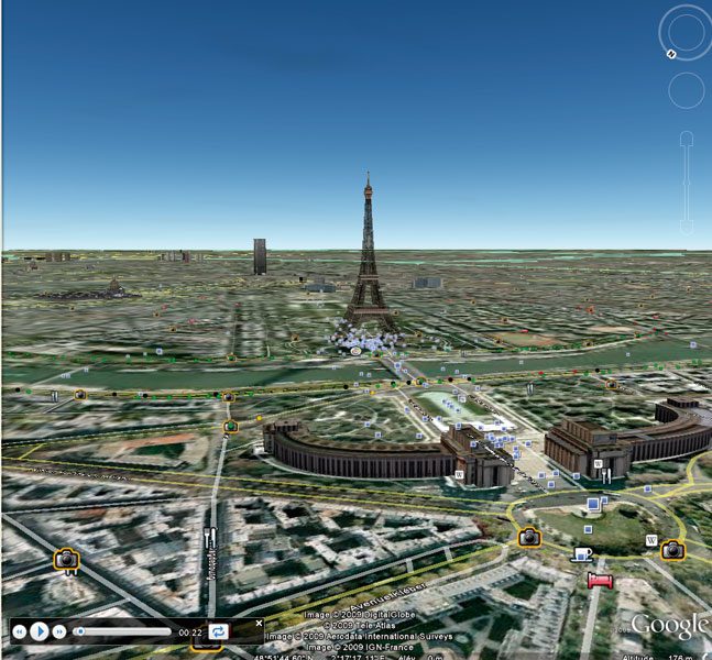 Le monde est vaste et vous ne savez pas par où commencer. Laissez-vous guider par Google Earth. Dans Lieux situés dans la marge de gauche, cochez Visite touristique, puis Commencer la visite ici. Celle-ci commence en l’occurrence par la tour Eiffel. Pour poursuivre le périple à travers le monde, appuyez sur la touche Play dans la Barre de lecture qui s’affiche à l’écran et faites glisser le curseur pour zoomer sur un lieu.