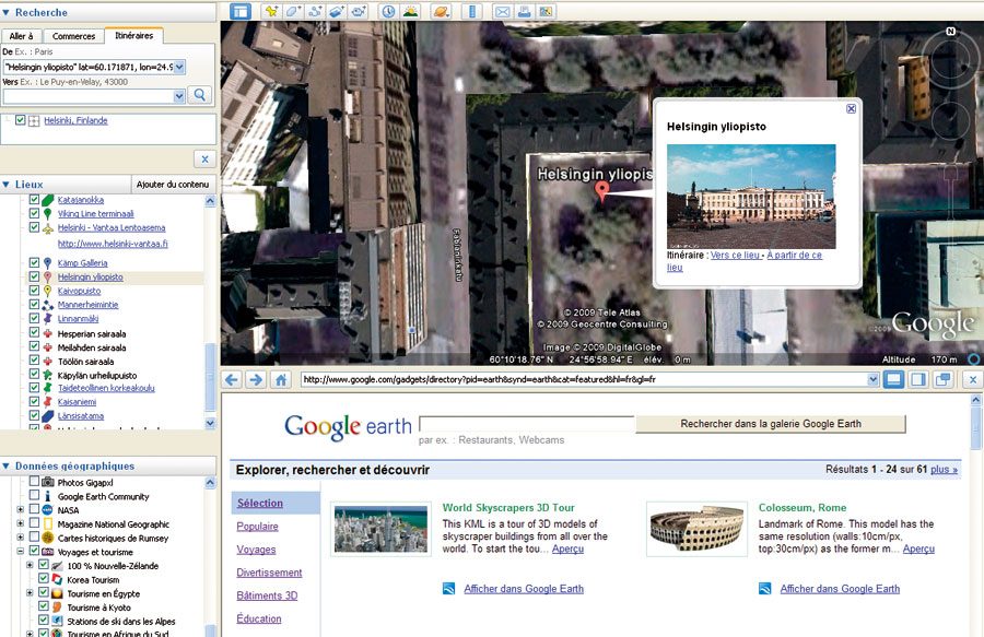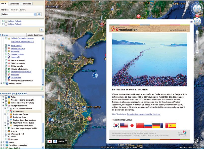 Dans Données géographiques (ou Infos pratiques), cliquez sur le + de Galerie, puis sur le + de Voyages et Tourisme. Choisissez l’une des (rares encore) destinations. Dernière en date : Korea Tourism. Pour visiter, repérez-vous au logo correspondant. Chaque point renvoie à une fiche explicative en français, photo à l’appui et insère un lien qui renvoie vers le site consacré au tourisme en Corée du Sud. En théorie, vous pouvez préparer votre voyage et créer des itinéraires. Faites un clic droit, sélectionnez Itinéraire depuis ce lieu, puis choisissez un autre lieu, faites à nouveau un clic droit sur Itinéraire vers ce lieu. Hélas, des bugs ne permettent pas toujours d’obtenir un résultat.