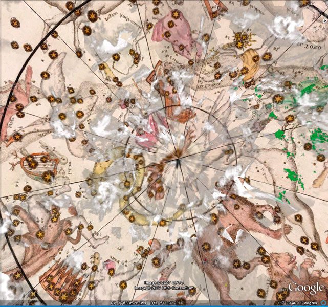Dans la Barre de boutons, cliquez sur le bouton en forme de petite planète et sélectionnez Sky ou Ciel. Puis dans Données géographiques (ou Infos pratiques), appuyez sur la touche + pour afficher l’ensemble des critères de la base de données Sky, activez Bienvenue dans Sky. Entre autres possibilités, vous pouvez repérer l’emplacement des planètes et leurs mouvements ou bien encore retrouver les cartes anciennes.