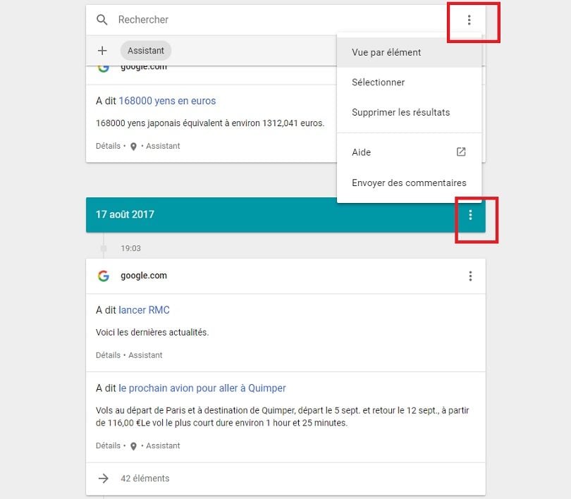- Les résultats de toutes les demandes effectuées avec Google Home s’affichent alors à l’écran. Ces résultats incluent également les demandes faites avec l’assistant Google de votre smartphone. Vous pouvez ensuite supprimer une demande spécifique en cliquant sur le bouton des trois petits points verticaux, puis sur Supprimer.