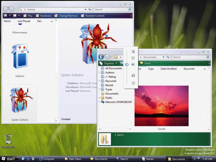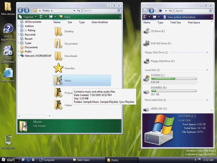 contact, Windows Vista semble stable, l’installation se déroulant sans heurts et automatiquement. Une petite déception : les nouveautés les plus attendues, comme le dock ou la sidebar (barre latérale), ne sont pas encore présentes.Du coup, pas de surprise : l’interface graphique ressemble assez à celle de Windows XP, avec tout de même quelques améliorations notables comme le menu Démarrer nouvellement pensé, où l’arborescence des sous-menus est