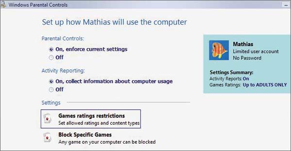 Accessible depuis le panneau de configuration, la fonction de contrôle parental permet de bloquer l’accès à certains logiciels (pour l’instant, les jeux). Un parent peut ainsi décider si un enfant a le droit ou non d’utiliser