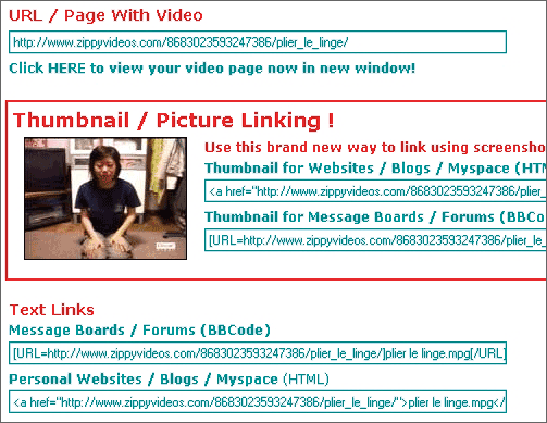 perso.Utilisez le lien situé sous Thumbnail for Websites/Blogs/Myspace (HTML) pour pointer sur une vignette de la vidéo.Enfin, les deux liens Message Boards/Forums (BB-Code) (avec ou sans vignette) sont à utiliser avec les forums.