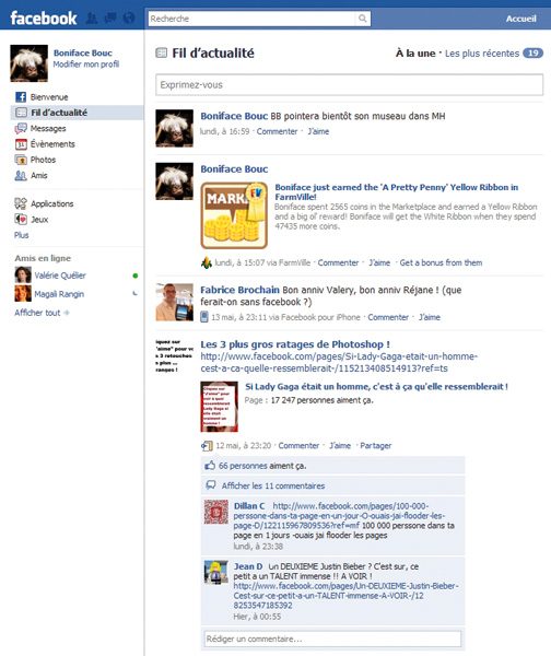 Le fil d’actualité sert aussi à suivre l’activité de vos amis. Quand ils postent textes et photos sur leur page Facebook, ceux-ci apparaissent automatiquement sur votre fil d’actu, sans besoin de consulter leur page. Le tout apparaît à la manière d’un blog, avec une présentation de la plus récente publication à la plus ancienne. Pour retrouver uniquement vos publications, un clic sur le menu Profil, puis sur l’onglet Mur, affiche votre Mur. Quand vous allez directement sur la page d’un ami, c’est, de la même façon, son Mur que vous voyez. Autre façon d’interagir : le bouton Commenter accompagnant chaque publication. Il permet d’écrire une réaction, qui peut en déclencher beaucoup d’autres, et donner lieu à de véritables conversations mêlant vos amis et les amis de vos amis.