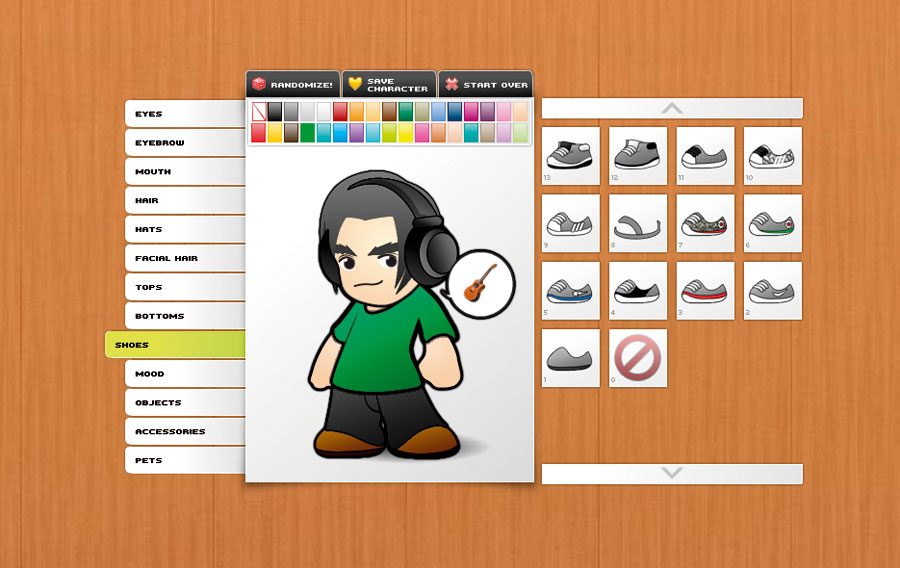Dans la même veine japonaise, Rasterboy permet de créer un garçon ou une fille à son image, mais de manière moins détaillée. Si les coiffures d’inspiration manga sont nombreuses, en revanche les traits du visage sont limités (pas de nez, par exemple). On se rattrapera sur les accessoires : couvre-chefs, chaussures, objets personnels et bulles précisant l’humeur du moment. Il faut ensuite faire une capture d’écran pour récupérer le portrait en pied (la commande Save character reste sans effet).