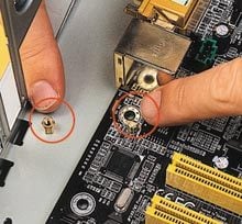 Nous vissons la carte mère sur les plots. Il faut vérifier que les connecteurs à l’arrière sont bien ajustés avec les ouvertures. Si on le désire, on peut insérer des rondelles d’isolation (livrées avec le boîtier) entre la carte