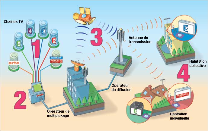 antenne d’émission (par exemple la tour Eiffel).Les émetteurs principaux réceptionnent le signal, puis arrosent d’autres émetteurs secondaires qui servent de relais jusqu’aux habitations. Au niveau des émetteurs principaux, il est prévu de pouvoir ajouter au bouquet