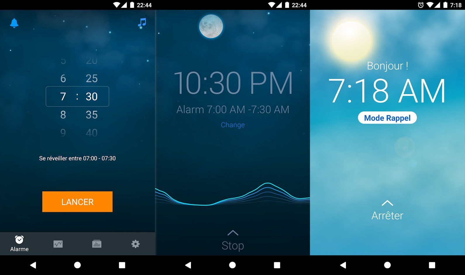Sur un modèle similaire, Sleep Cycle analyse les sons émis par les dormeurs pour déterminer une heure de réveil quasi-parfaite. Contrairement à Sleep as Android, l’application se sert peu de l’accéléromètre du smartphone. Il n’est donc pas utile de disposer l’appareil dans le lit.
