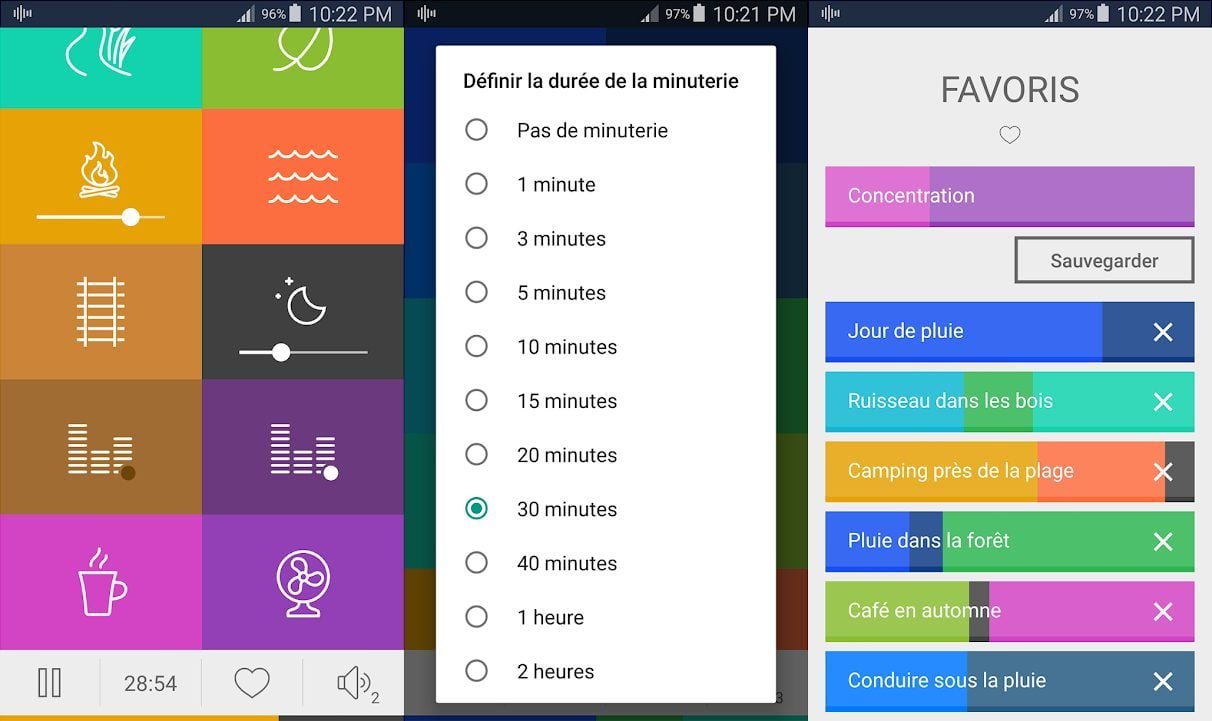 Personnalisables dans les moindres détails, Bruit blanc et myNoise laissent aux insomniaques la possibilité de régler l’intensité sonore de chaque échantillon. Il est possible de sauvegarder ces mélodies relaxantes dans ses favoris afin de les retrouver facilement. Et pour éviter d’être réveillé au milieu de la nuit par ces mêmes mix diffusés en boucle, les deux applis intègrent une minuterie que l’on configure selon ses besoins.